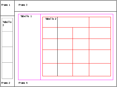 zur Verfügung: Frames und Tabellen. Beide teilen den Bildschirm in Kästchen auf, beide können in relativen und absoluten Abmessungen angegeben werden. Eine Kombination beider Techniken ermöglicht recht genaue Positionierungen.